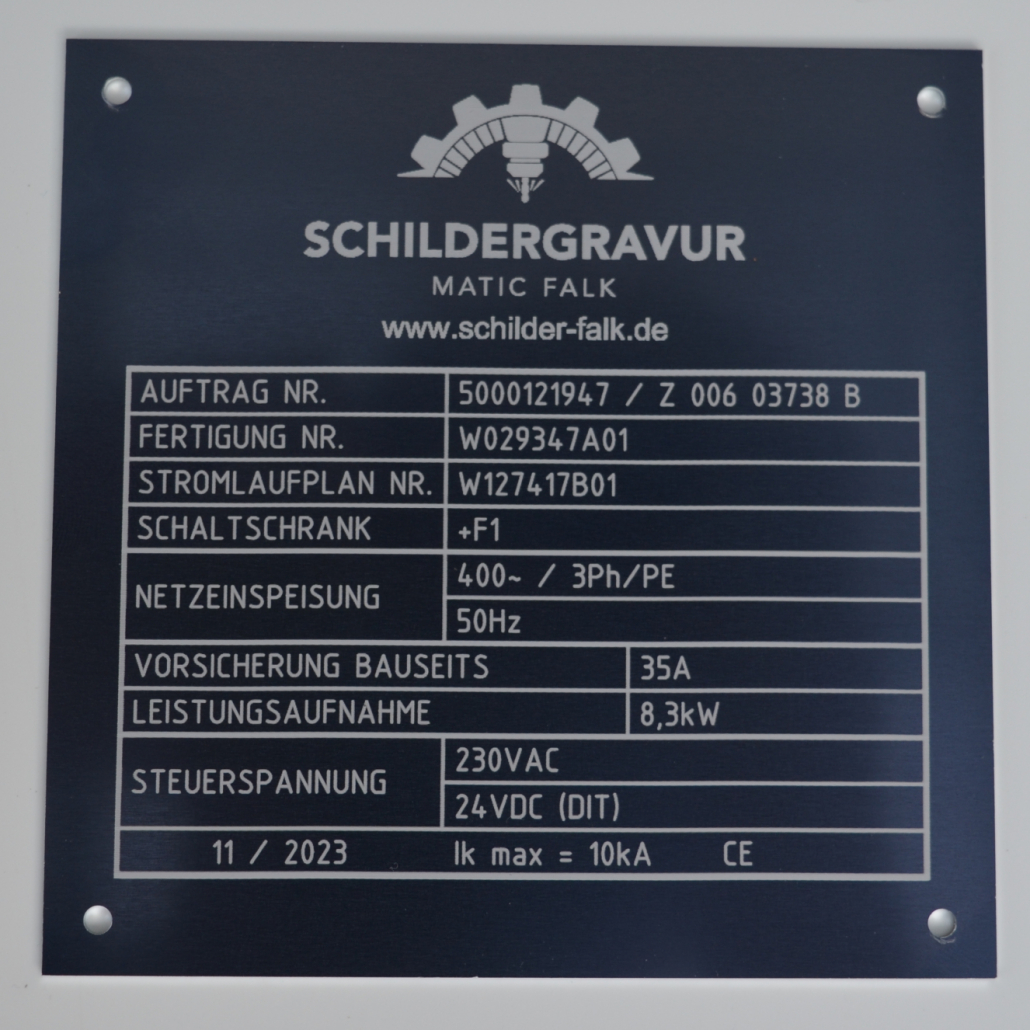 Hochwertige CNC-gravierte Typenschilder aus Metall für Elektroanlagen aller Art.